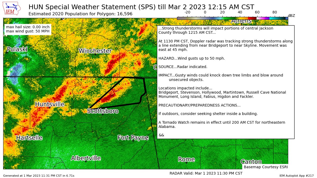 11:32 - All right, here is a special weather statement about what is still going on in Jackson County. From what I'm seeing, there was another tornado damage area, think it was the thing that spun up near New Market. So we've got that and the one in Marion County, they will have to survey tomorrow I guess, when hopefully there is a break in the action before Friday morning's severe weather threat. Those two areas, it sounds to me like a tornado was confirmed because of the debris signatures on radar and there being damage. The one in I think Limestone County had the roof taken off a house. I saw it on Brad Travis's stream. I bounce around TV stations while watching stuff online sometimes.
