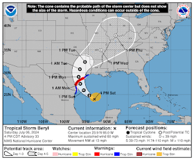 Tropical Storm Beryl is expected to strengthen back to a hurricane before making landfall somewhere along the coast of Texas. The areas most likely to feel hurricane impacts are under a Hurricane Warning down there, as noted in detail in the post previous to this one. And to either side, some other places are under a Tropical Storm Warning, where the winds are expected to stay lighter, which here only means under 74 miles per hour.